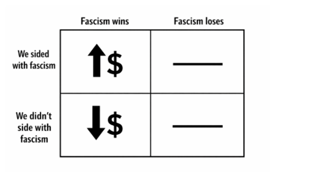 The bigger the cost we impose (the bigger the dollar sign in the upper right box below), the more we open them up to the alternative: not siding with fascism.